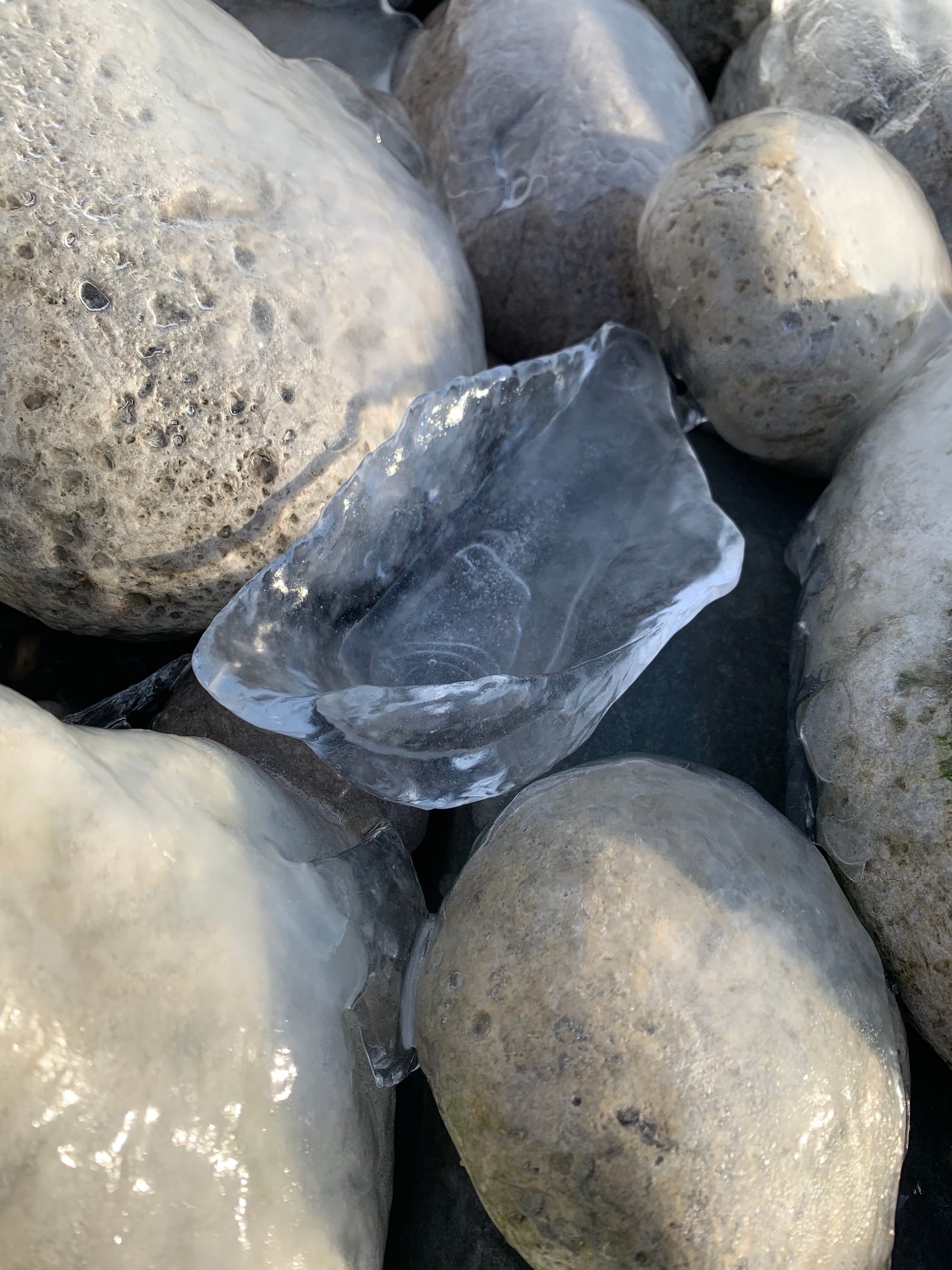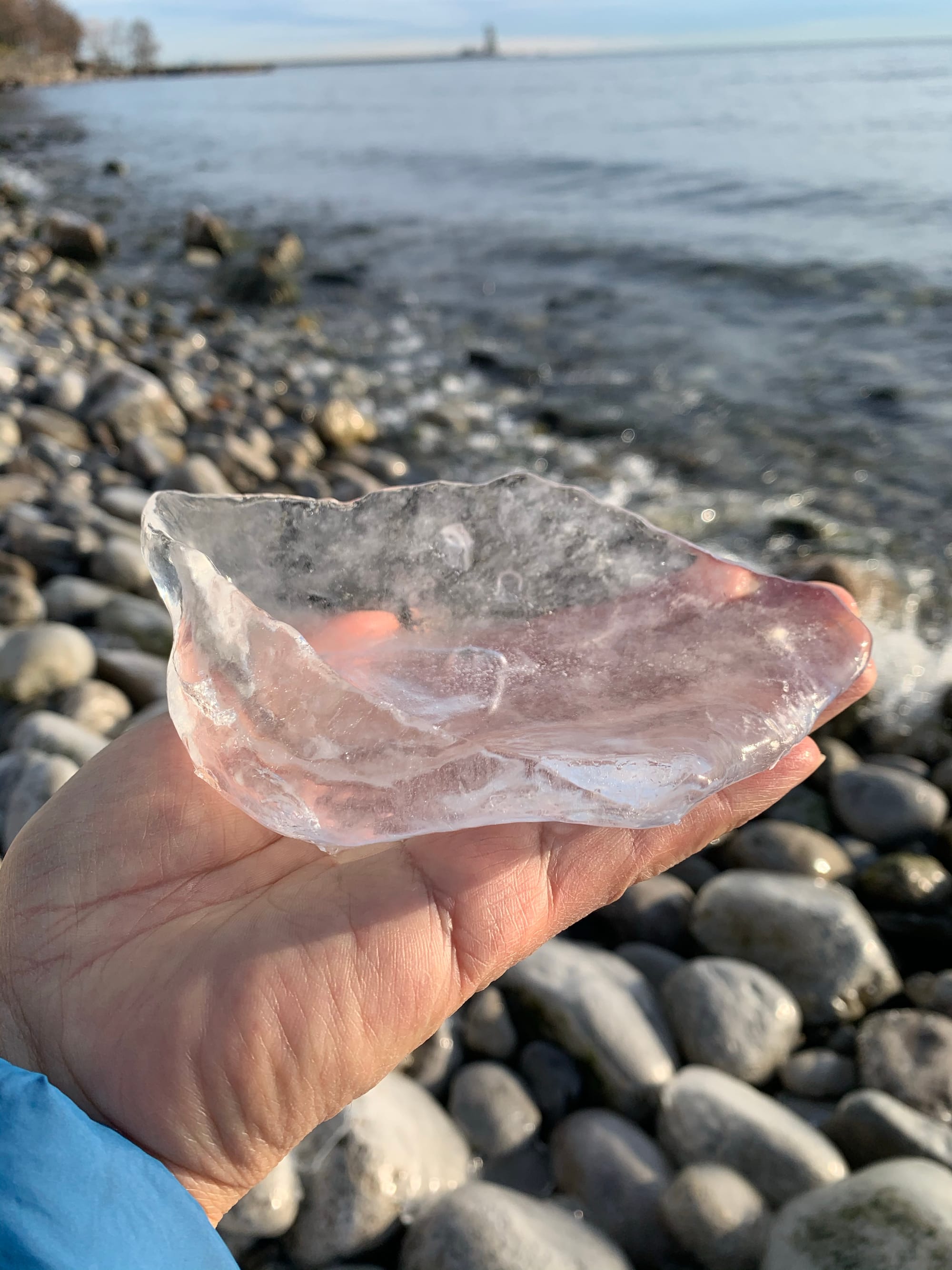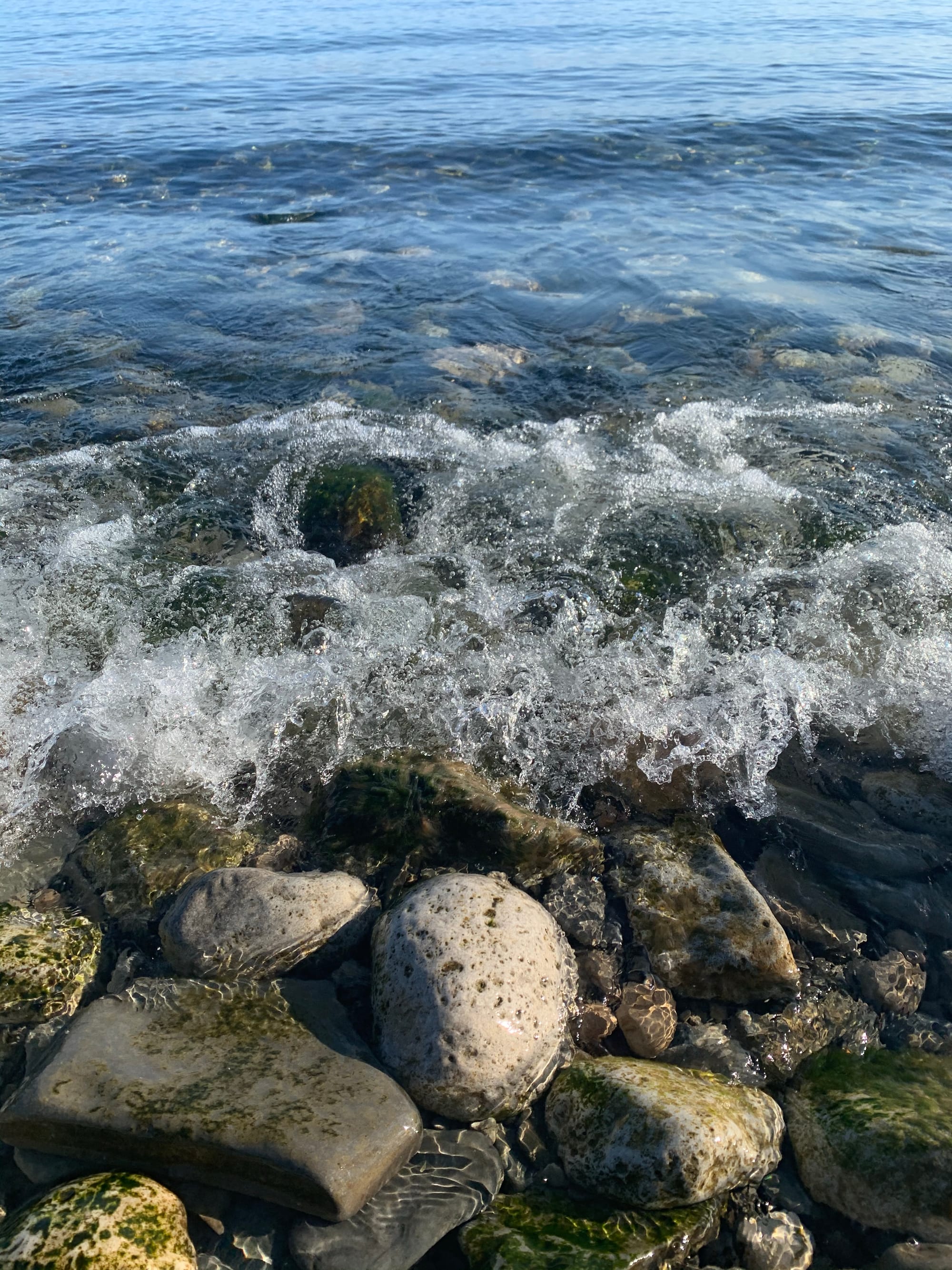 At the shore, the water is pure and clear. Gentle breeze pushes tiny waves onto the pebbles, created many beautiful crystals shells and all shapes of artworks.
