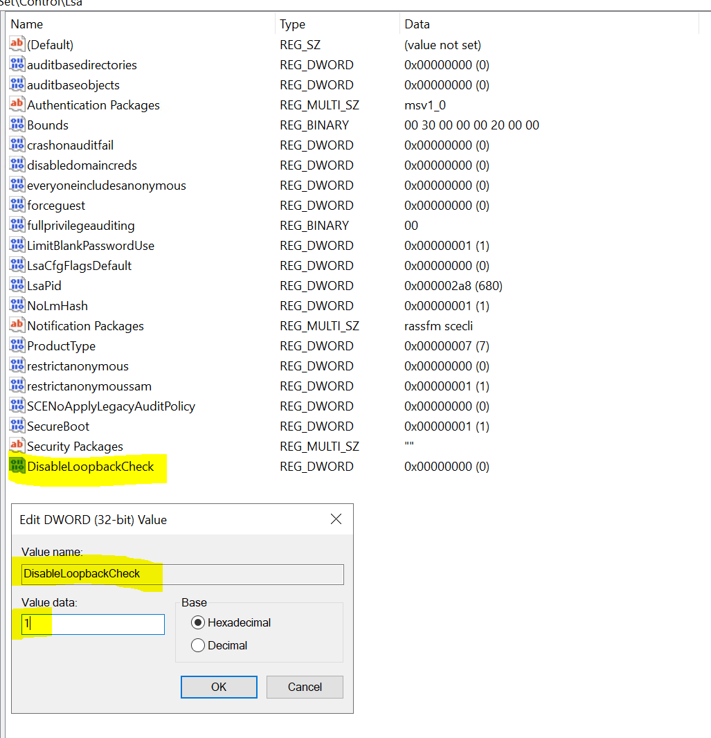 2. Create a new REG_DWORD entry: "DisableLoopbackCheck", set value to 1